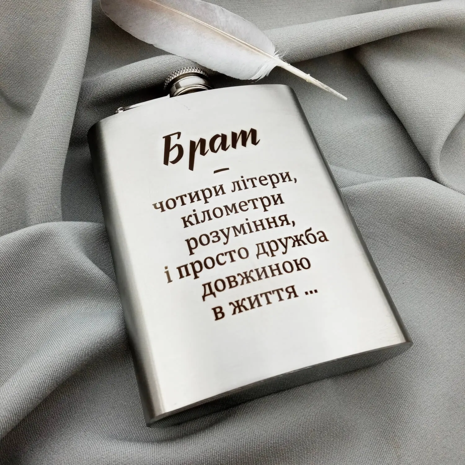 Сталева фляга з персональним гравіюванням є універсальним виробом та ідеальним подарунком. Ємність виготовлена з харчової нержавіючої сталі, має гарну місткість, а також велику площу поверхні для нанесення будь-яких логотипів, шевронів, зображень або текстової інформації.