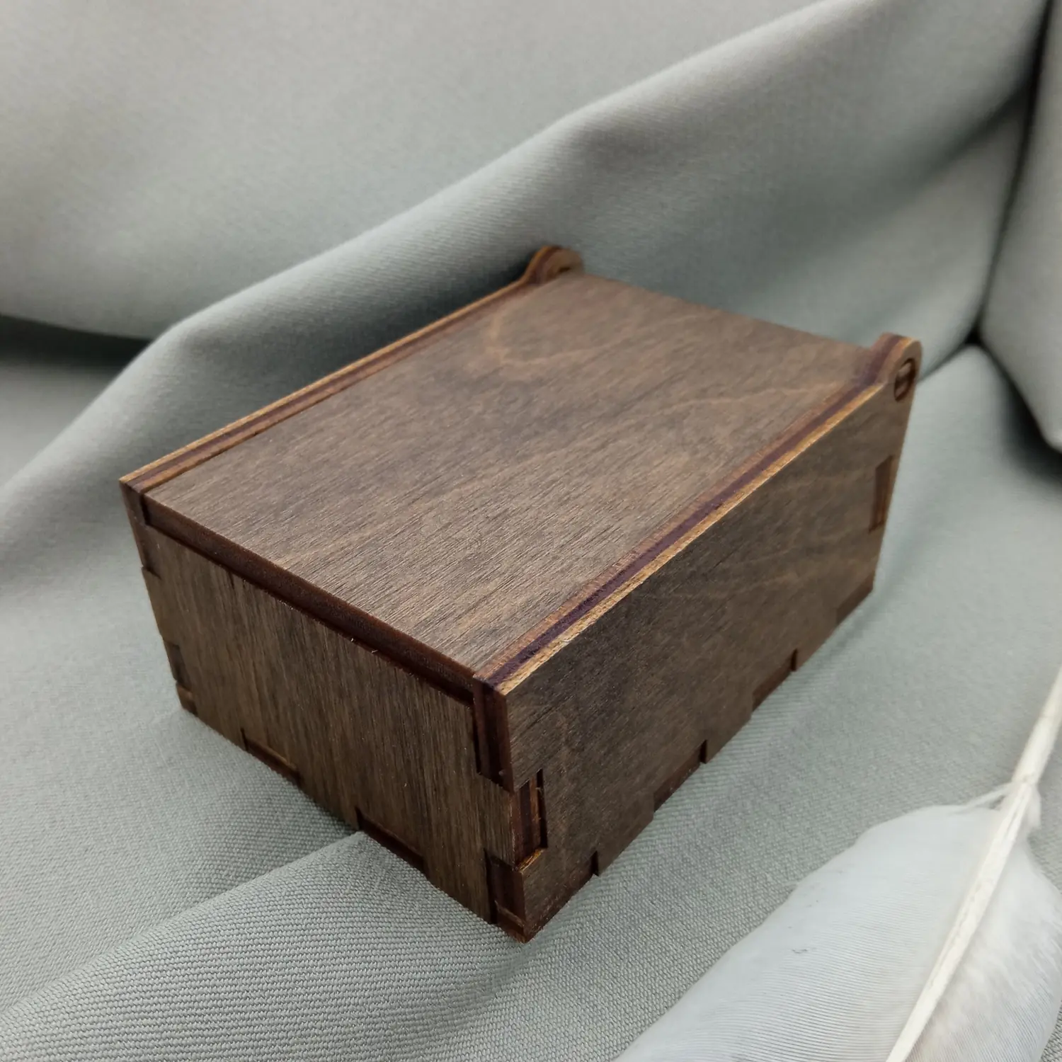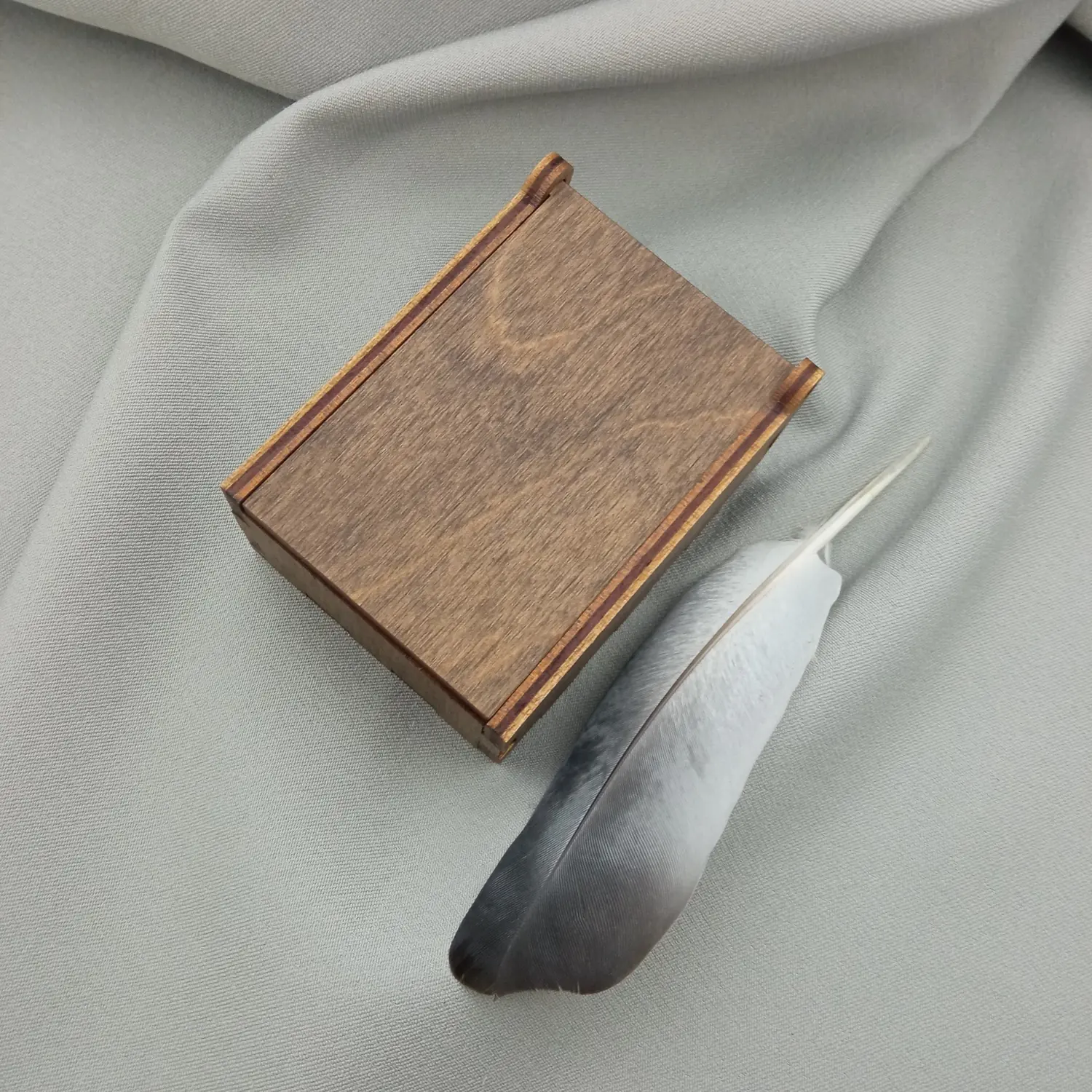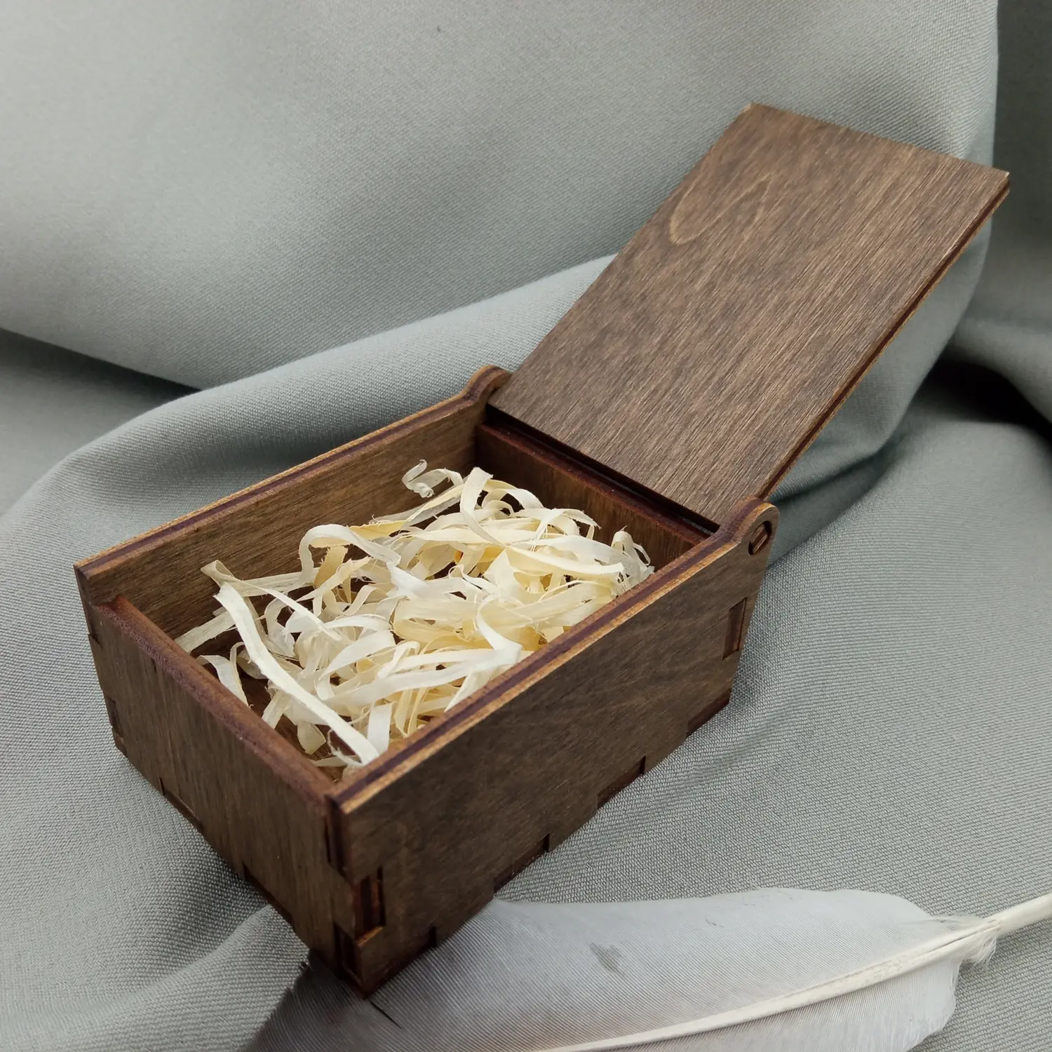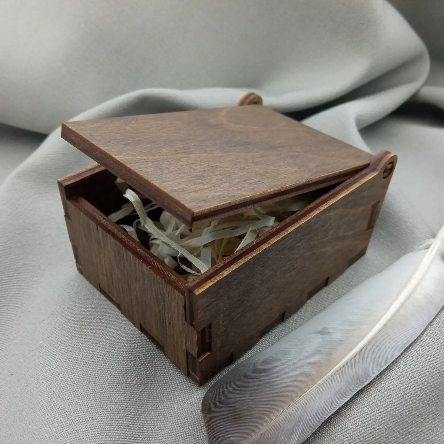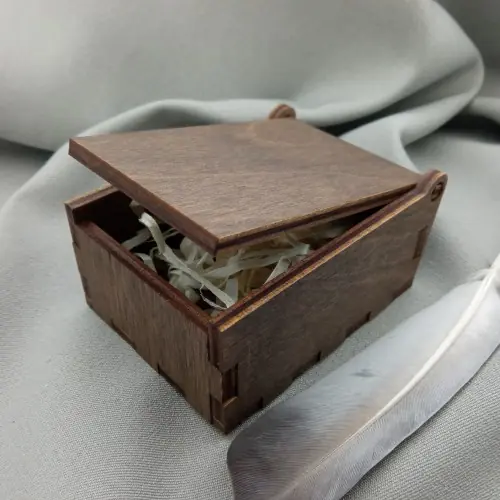Дерев'яна коробочка, яка оброблена морилкою і наповнена декоративним сіном, є красивою упаковкою для наших виробів з персональним гравіюванням. Ідеально підійде для жетонів, кулонів, підвісок і запонок, а також інших невеликих індивідуальних виробів.