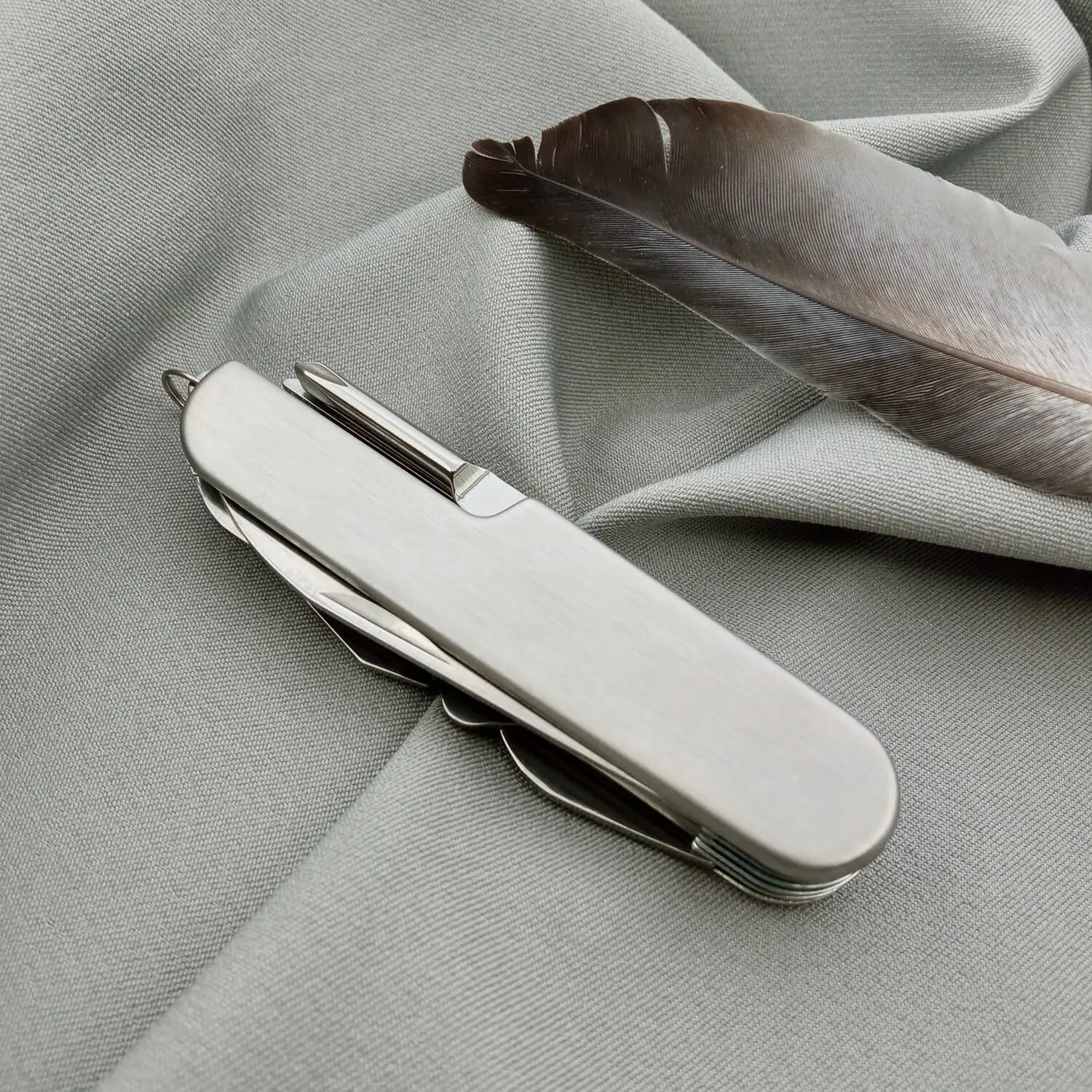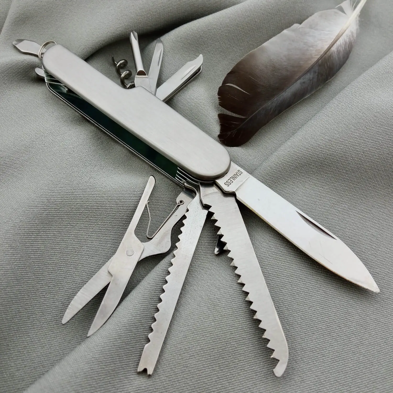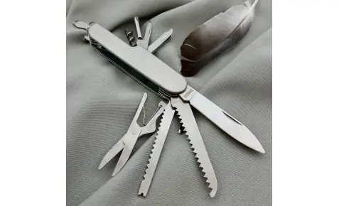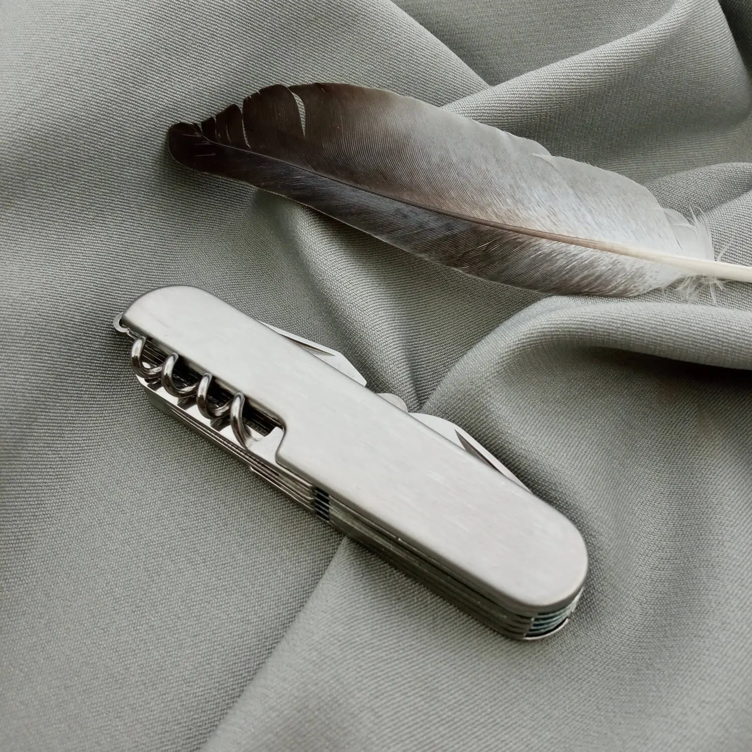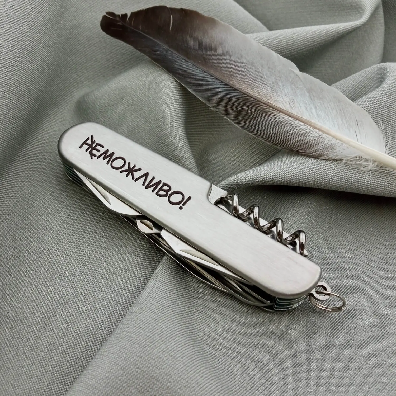 Універсальний багатофункціональний мультитул (11 в 1) для мандрівників, військових та любителів активного відпочинку. Всі 11 предметів (леза, пилки, штопор, відкривачка, викрутка, ножиці тощо) виконані з нержавіючої сталі, що забезпечує надійність та міцність елементів, а, завдяки алюмінієвому сплаву руків’я, ніж зберігає легку вагу у 116 грамів. Велика площа рукоятки дозволяє гравіювання великих текстів та зображень під замовлення.