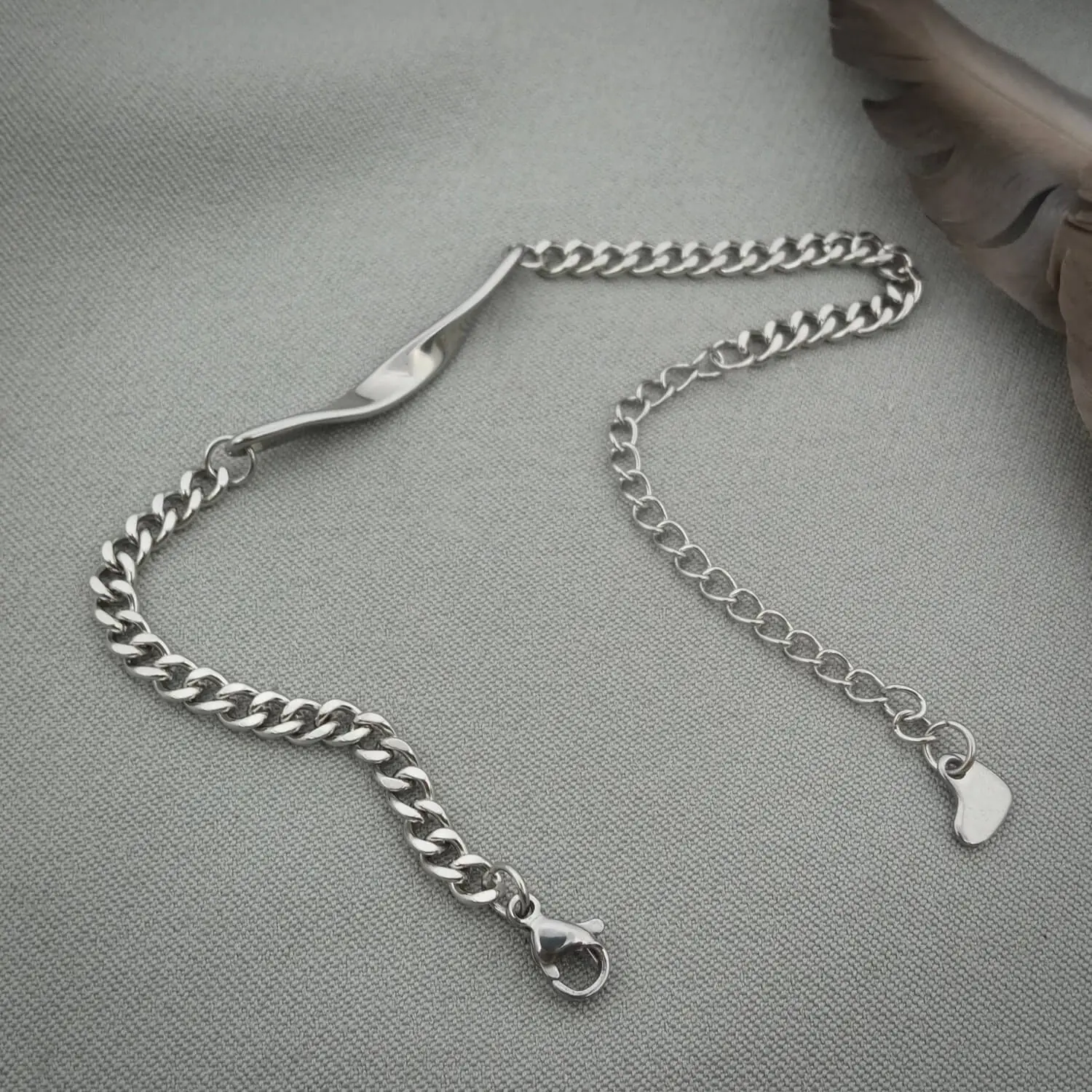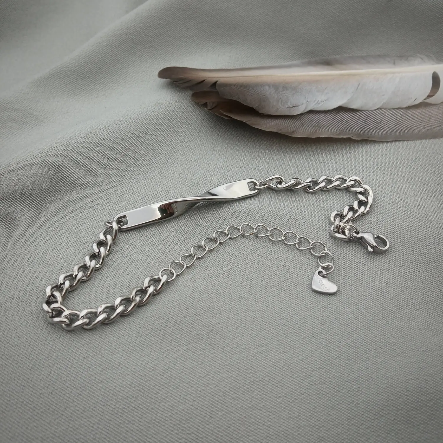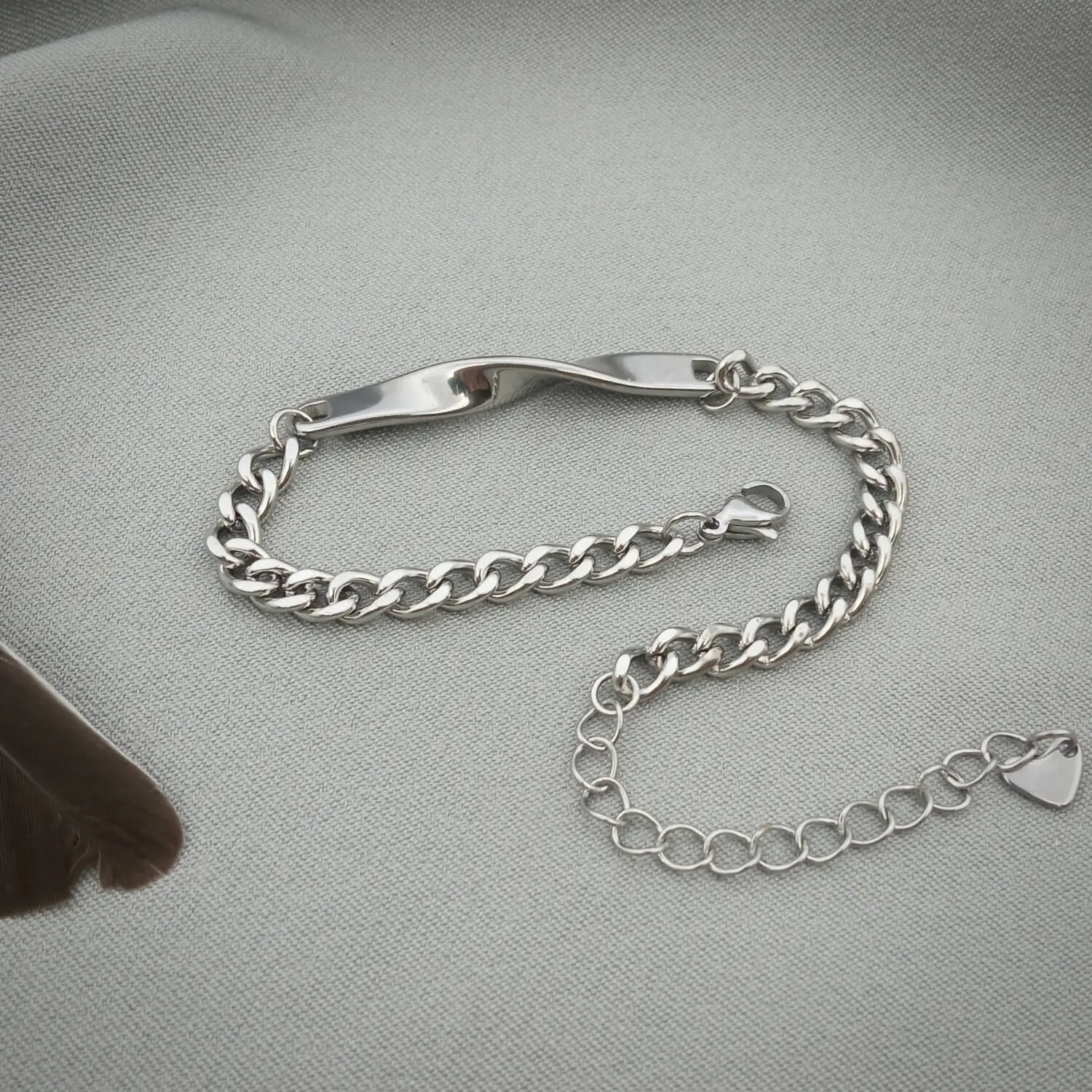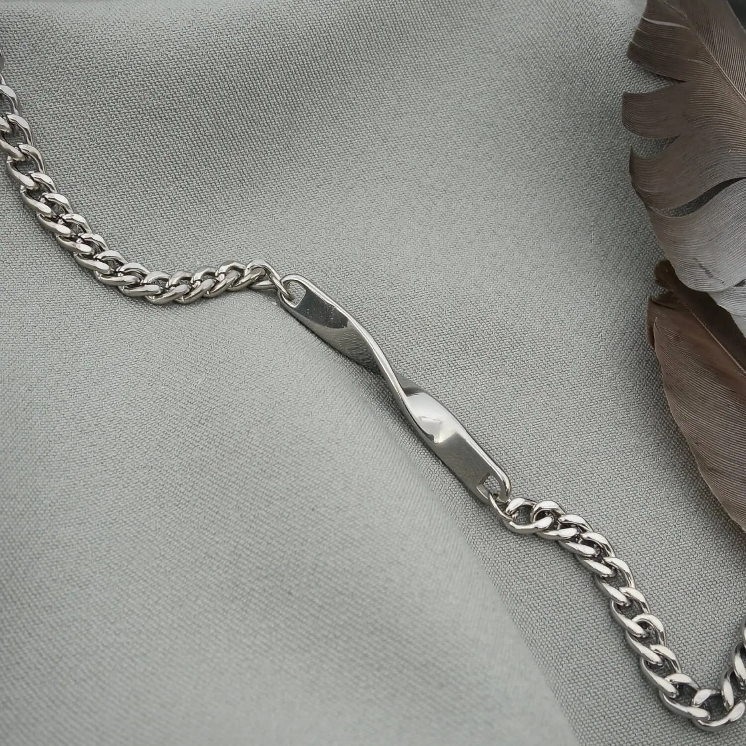 Сталевий браслет «Луна» - форма, що зберігає сенс. Це прикраса про зв’язок, що не зникає з часом. Лаконічний браслет з нержавіючої сталі 304L має витончену вигнуту форму, яка ніби повторює відлуння слів і почуттів, залишених у пам’яті. Центральний елемент плавно переходить у ланки, створюючи відчуття цілісності та балансу. Індивідуальне гравіювання перетворює браслет на особистий символ. Ім’я, дата або слово набувають особливого значення, стаючи тихим нагадуванням про важливе - те, що лунає всередині знову і знову. Нержавіюча сталь 304L забезпечує довговічність, стійкість до щоденного носіння та зберігає благородний блиск прикраси. Стриманий дизайн робить браслет універсальним - він органічно доповнює як повсякденний образ, так і більш особливі моменти. «Луна» - це не просто браслет. Це слід слів, почуттів і спогадів, які залишаються з вами.