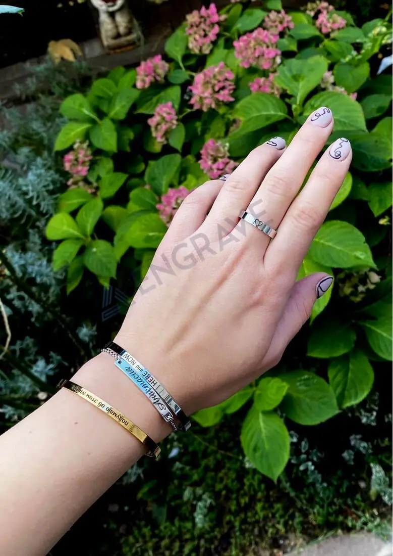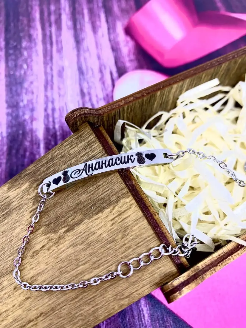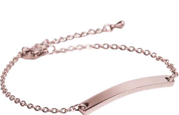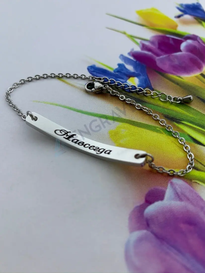 Вишуканий і витончений сталевий браслет з ланцюжком і вигнутою пластиною для персонального лазерного гравіювання ідеально доповнює будь-який образ. Ювелірна неіржавна сталь 316L, з якої виконано виріб, гарантує надійність, довговічність і стійкість до води, а можливість нанесення гравіювання, як з зовнішньої, так і з внутрішньої сторони, дозволяє зберігати при собі найпотаємніші побажання, імена коханих або пам'ятні дати. Доступний в трьох популярних кольорах: сріблястий, чорний і позолочений.
